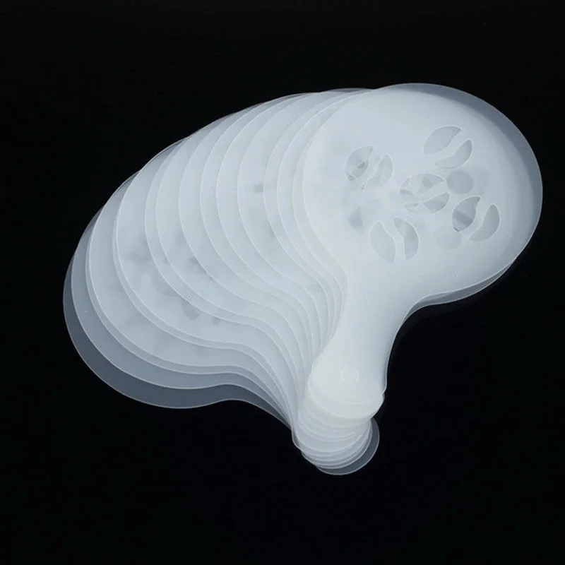 Zestaw 16 wzorników do kawy, wykonanych z palstiku.